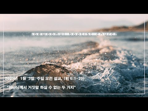 관리자김상진 2021.01.08 설교 및 말씀 주일설교 "하나님께서 거짓말 하실 수 없는 두 가지", (히 6:1-20) 히브리서 6장은 그분의 약속에 따른 보상을 믿는 믿음을 요구합니다. 하나님은 '그리스도의 이름을 위한 모든 행위'와 '성도들(교회)을 향한 사랑의 수고'를 아끼지 않았을 때 반드시..